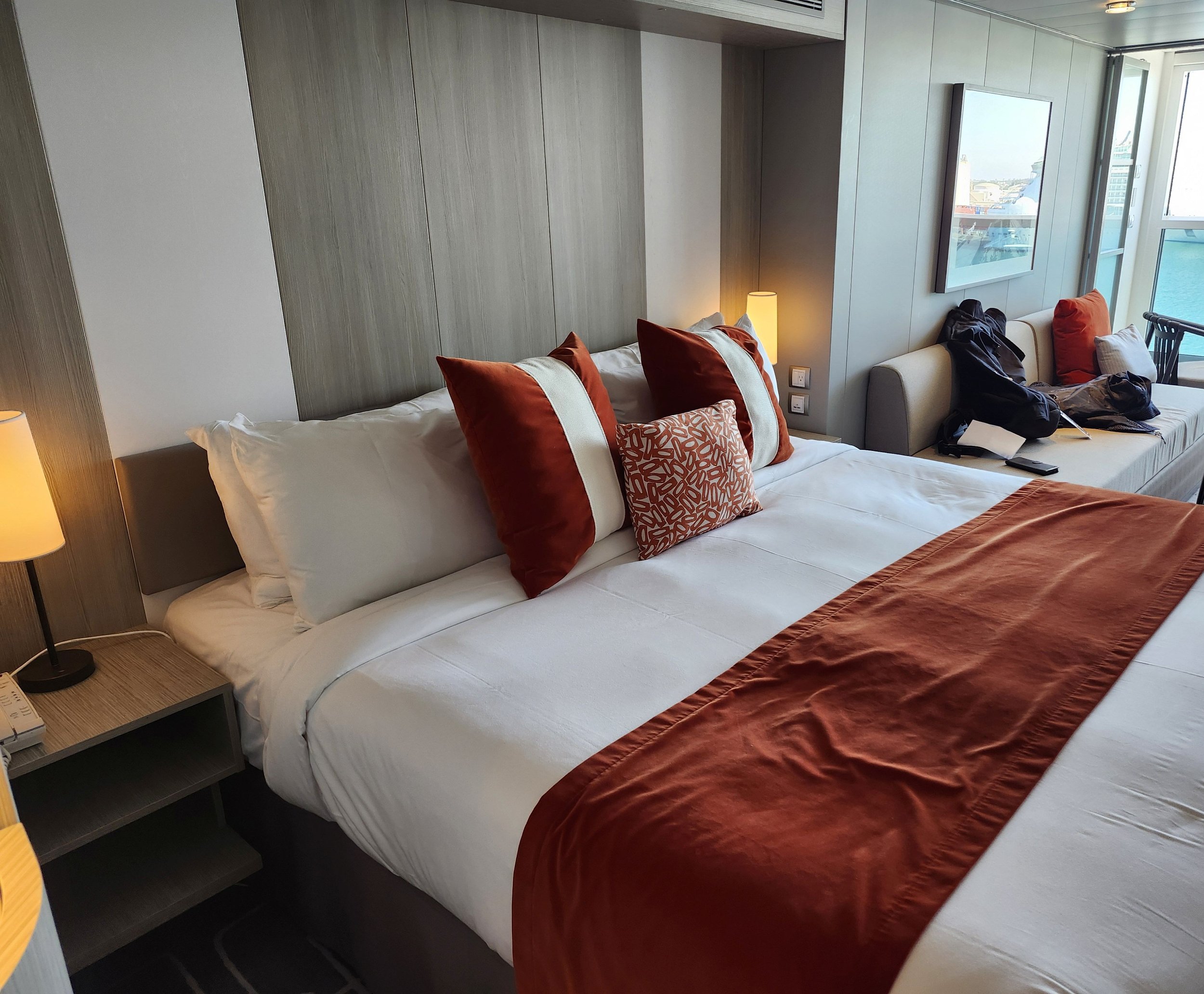 Our stateroom was almost Aft-Facing – a large Infinite balcony room, which means you don’t walk out to a balcony, it’s part of your Stateroom, and you push a button on the wall for the top half of the full window to descend, and then it looks like a balcony (see the pic) The window, blackout blind, and room temperature are all controlled by the Celebrity app on your phone- although the AC won’t work if the window is open. Another cool feature is that if the Captain deems it too windy or rainy to have the window open, the button won’t work. Some people don’t like the Infinite Balcony – some love it – I’m in between, and Steve prefers a traditional balcony. What I really liked was having extra space in the room, and having a separate spot to sit and read or gaze at the water, no matter what the weather.