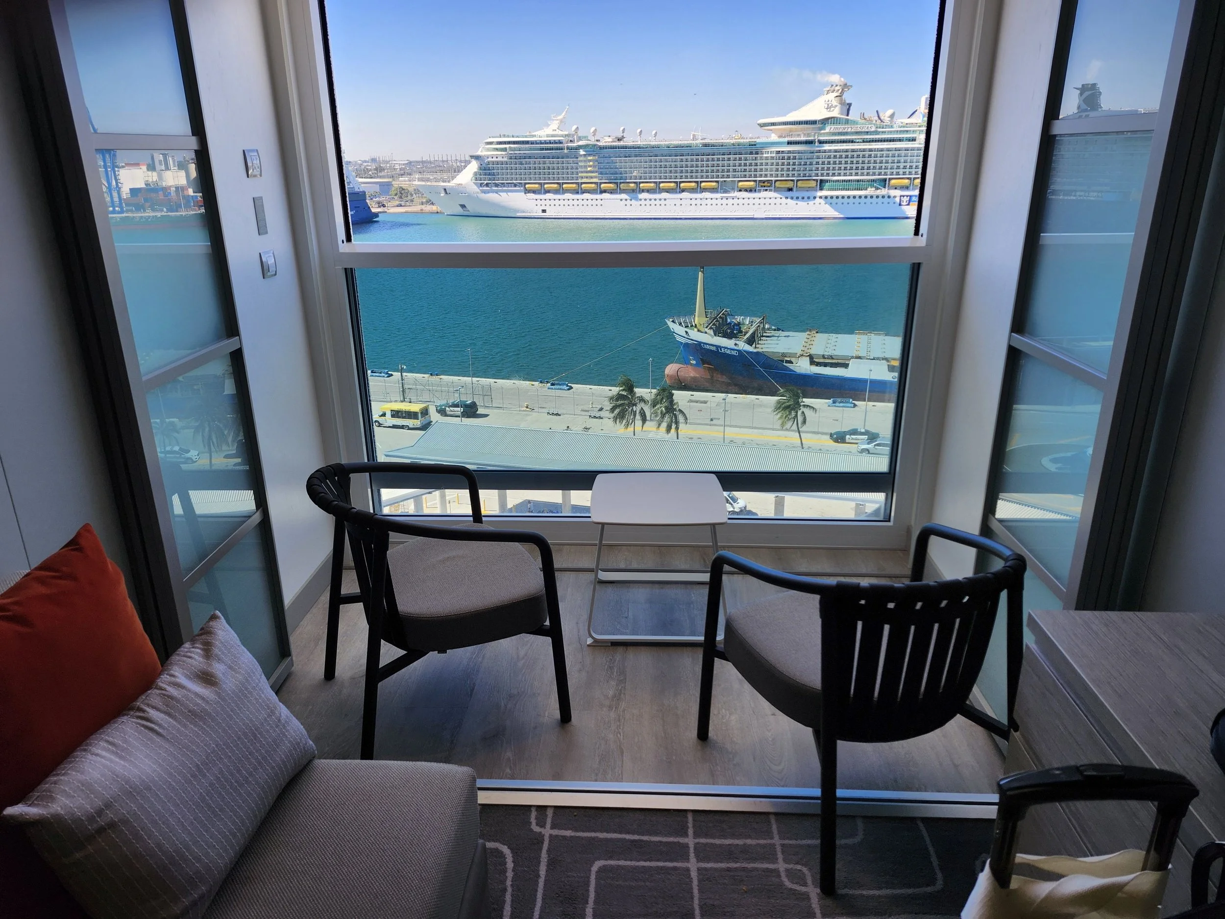 Our Westjet flight direct from Toronto to Fort Lauderdale, Florida was very pleasant and right on time. As usual, we stayed one night at the Homewood Suites Fort Lauderdale Airport-Cruise Port in Dania Beach. We hadn’t been there in a couple of years, and I observed that it needs a good steam-cleaning, but the staff was cheerful and helpful as usual, the bed was comfy and there was lots of room. For dinner, we ordered Subway sandwiches online, they were delivered to the room by Door Dash, and we got a bottle of wine from the hotel. We were wiped out from traveling so we had a long night’s sleep, enjoyed the complementary breakfast, and took the shuttle from the hotel to the pier. You pre-book it through the hotel when you check in and it’s $20 USD cash each.